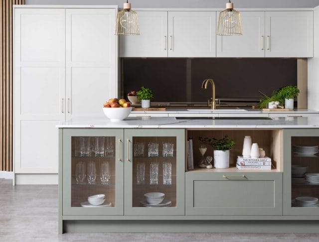 - Shaker kitchens are known for their understated elegance and simple lines. This means they can pair well with simplified features like open shelving or more extravagant features like large kitchen islands with luxurious quartz worktops.