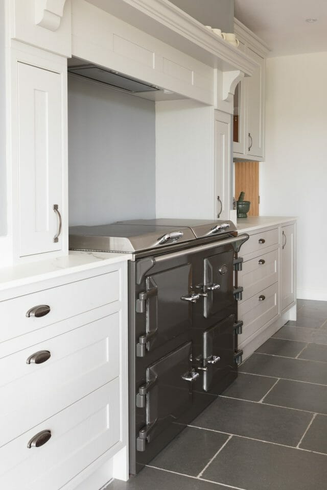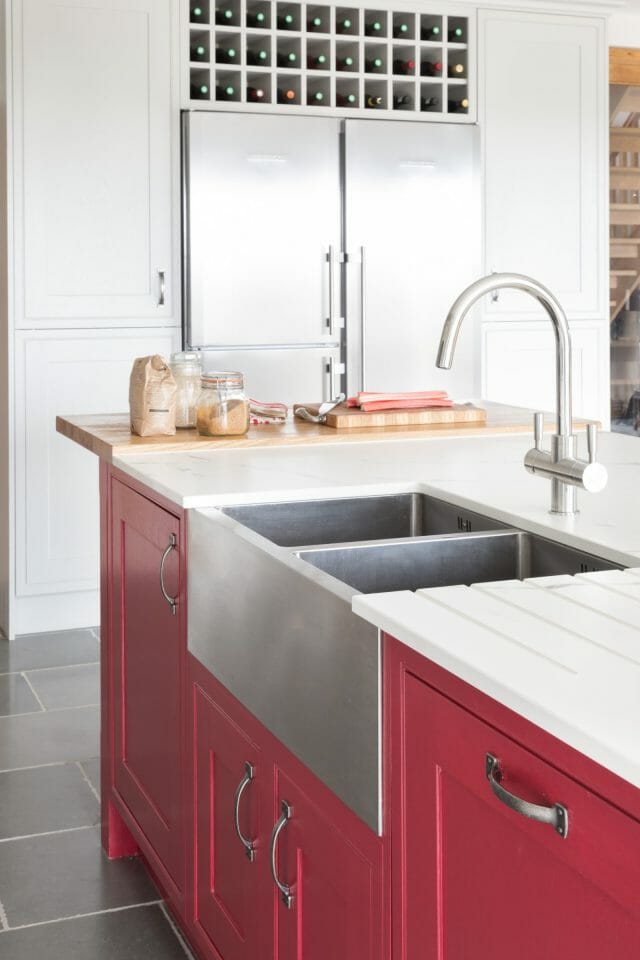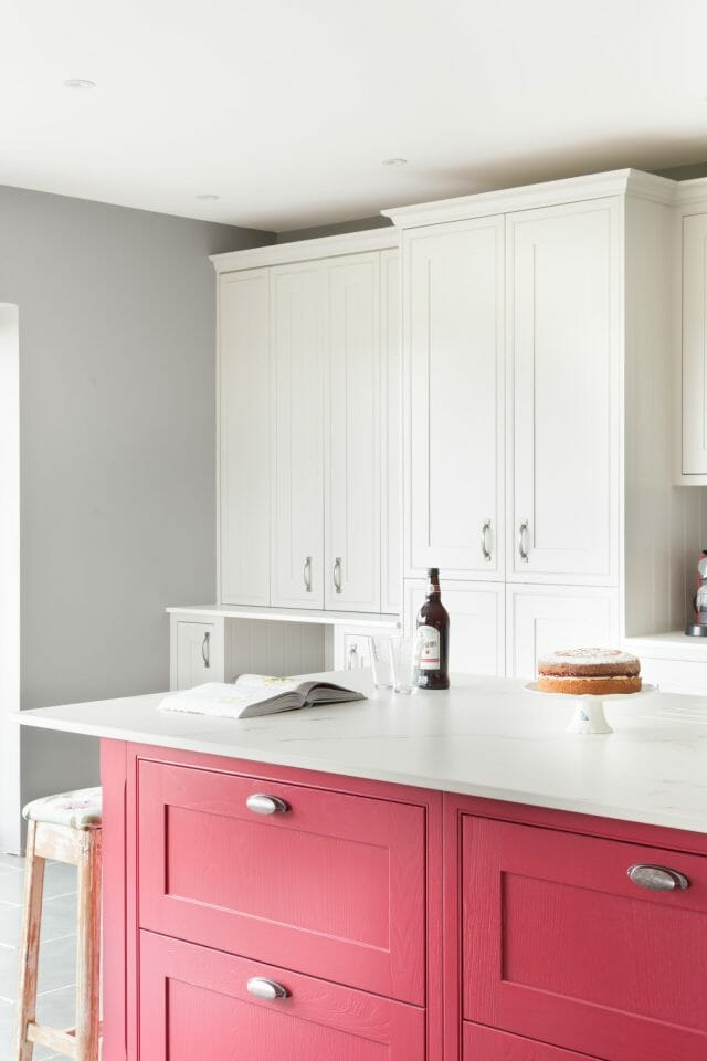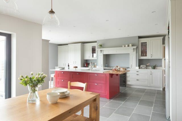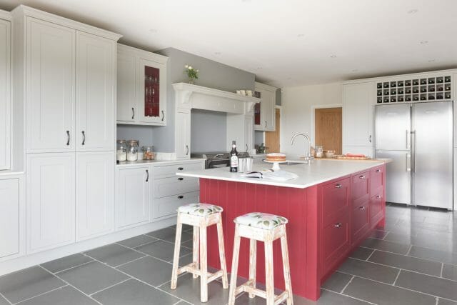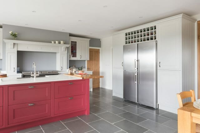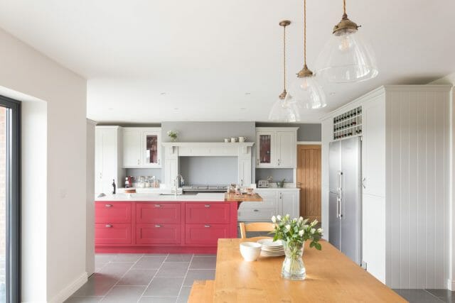 We particularly like the striking red for the kitchen island, paired with pale grey cabinets, Dekton worktops and an Everhot oven, the results are simply stunning.