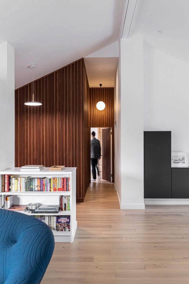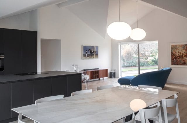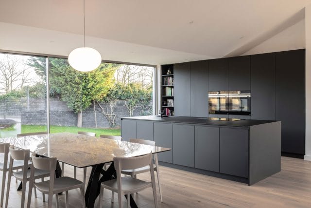 Wall-to-ceiling cabinetry in a uniform dark shade creates a striking visual continuity, ingeniously incorporating state-of-the-art appliances like a flush-mounted oven and microwave to maintain the kitchen’s polished look. Open shelves intersperse the cabinetry, offering a canvas for personal expression with books and trinkets that infuse the space with warmth and individuality. An additional dining zone is a natural extension of the kitchen, defined by a distinctive table flanked by contemporary chairs that mirror the kitchen’s colour scheme.