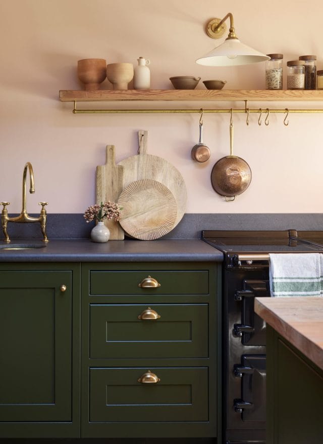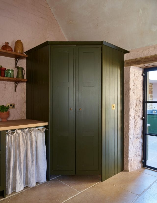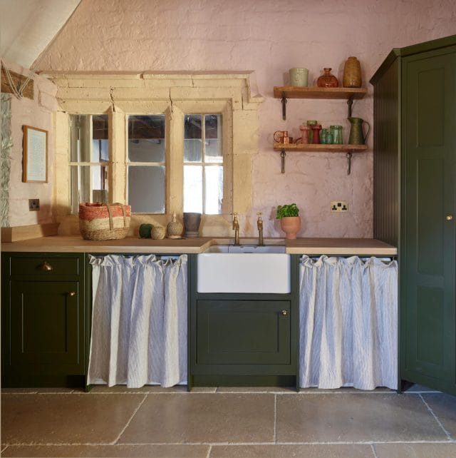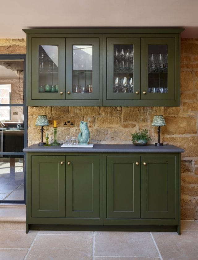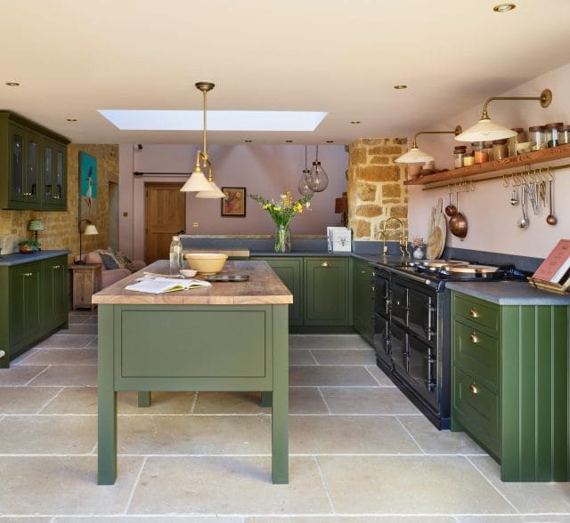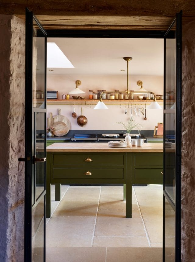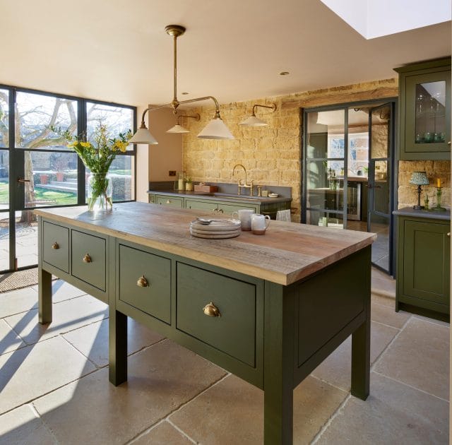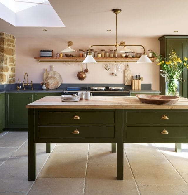 The room features a large freestanding prep table as its centrepiece with a solid wooden top and drawers for utensils and cutlery on both sides. There is ample storage provided by the base and wall cabinets too, along with the open shelving that the owners requested, a glazed dresser for glassware and a tall floor-to-ceiling cupboard. The limestone flooring works beautifully with the painted furniture, adding warmth and a rustic yet relaxed look, while the rooflight and full-height glazed windows and door onto the garden let the light flood in. The pale pink plaster colour on the walls also works beautifully with the scheme, enhancing the natural look and feel that this kitchen embraces so effortlessly.
