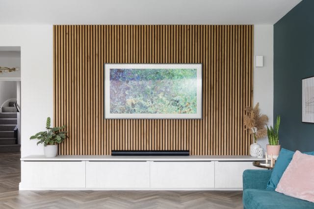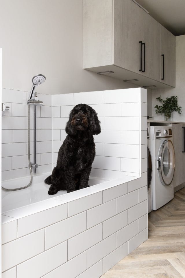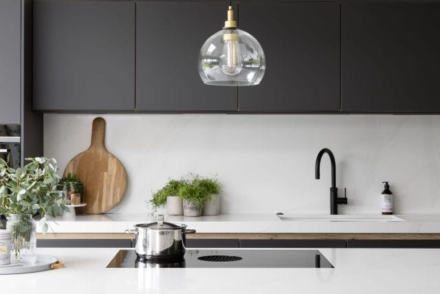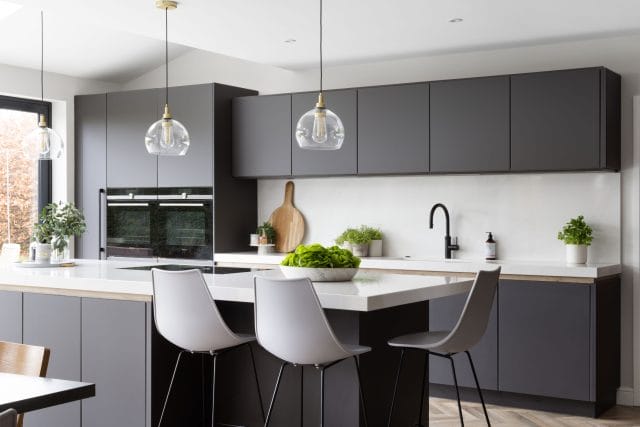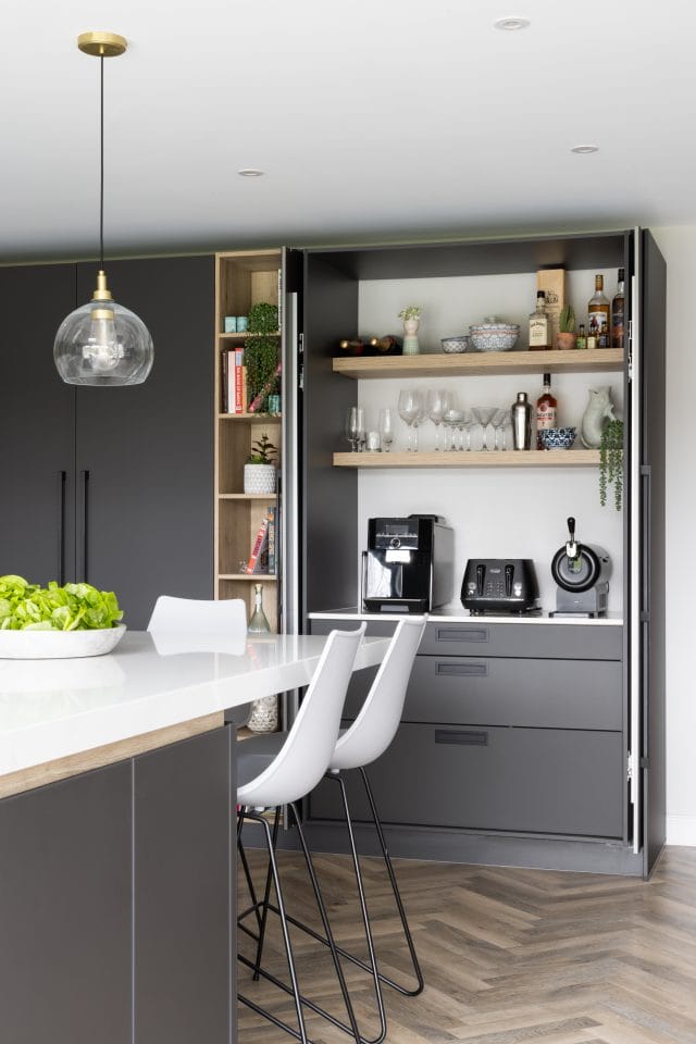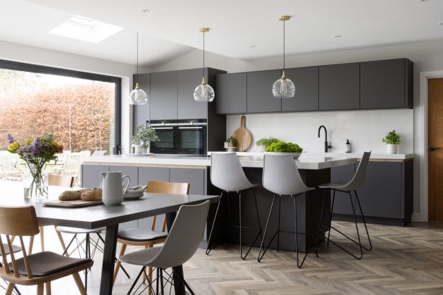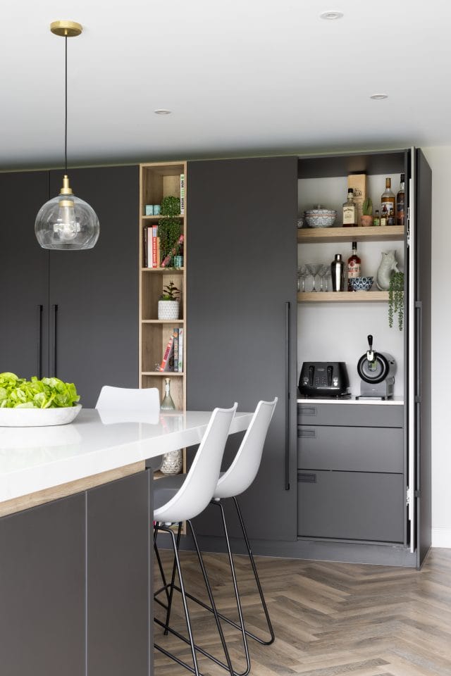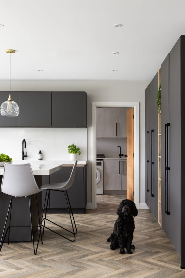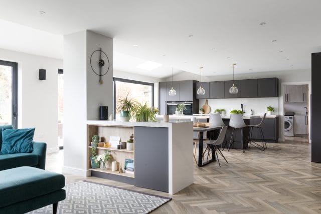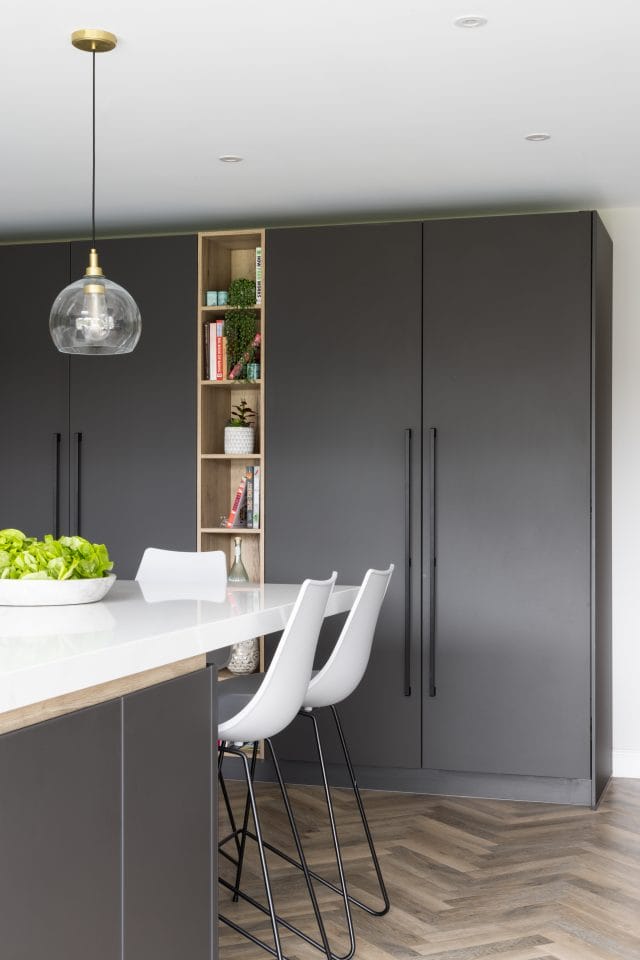 A large extension was added to the rear of this property we recently worked on in Worcester to create an open plan contemporary kitchen, dining and living area to accommodate all the family (3 young children and a dog). The kitchen is made in Germany by Pronorm and features ultramatte handleless doors in dark grey with pocket doors and Silestone quartz work surfaces in Callacatta Gold. There is a large dining table and the kitchen island has seating for all the family too. The living space is separate enough to remain cosy whilst staying connected to the kitchen for true open plan living. The flooring is Karndean Pale Limed Oak laid in a herringbone pattern and there is practical utility room with a shower we created especially for the dog.