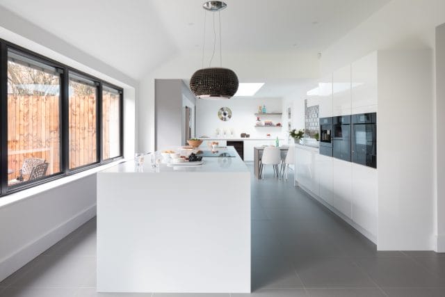 Mrs Hadley came to us looking for an industrial style kitchen that would compliment her original oak floor and work well against the new crittall doors and surrounding architecture. The originally brief started with a dark shaker kitchen, however after exploring the options with our designer Cathy it became clear that a sleek handless kitchen from German supplier Pronorm was the perfect solution.