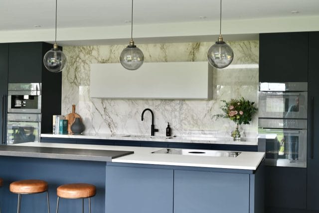 This kitchen is a blend of contemporary functionality and timeless style, marked by a refined colour scheme of deep blues and greys accented by the bold allure of marble. The focal point is the textured marble backsplash, whose captivating veins draw the eye, seamlessly extending over the worktop to include a sink graced by a matte black Quooker tap. The versatile island sits at the heart of the one-wall kitchen configuration, offering generous space for meal prep, casual dining, and socialising. Suspended above, graceful glass pendant lights with subtle vintage touches create an inviting and welcoming ambience.